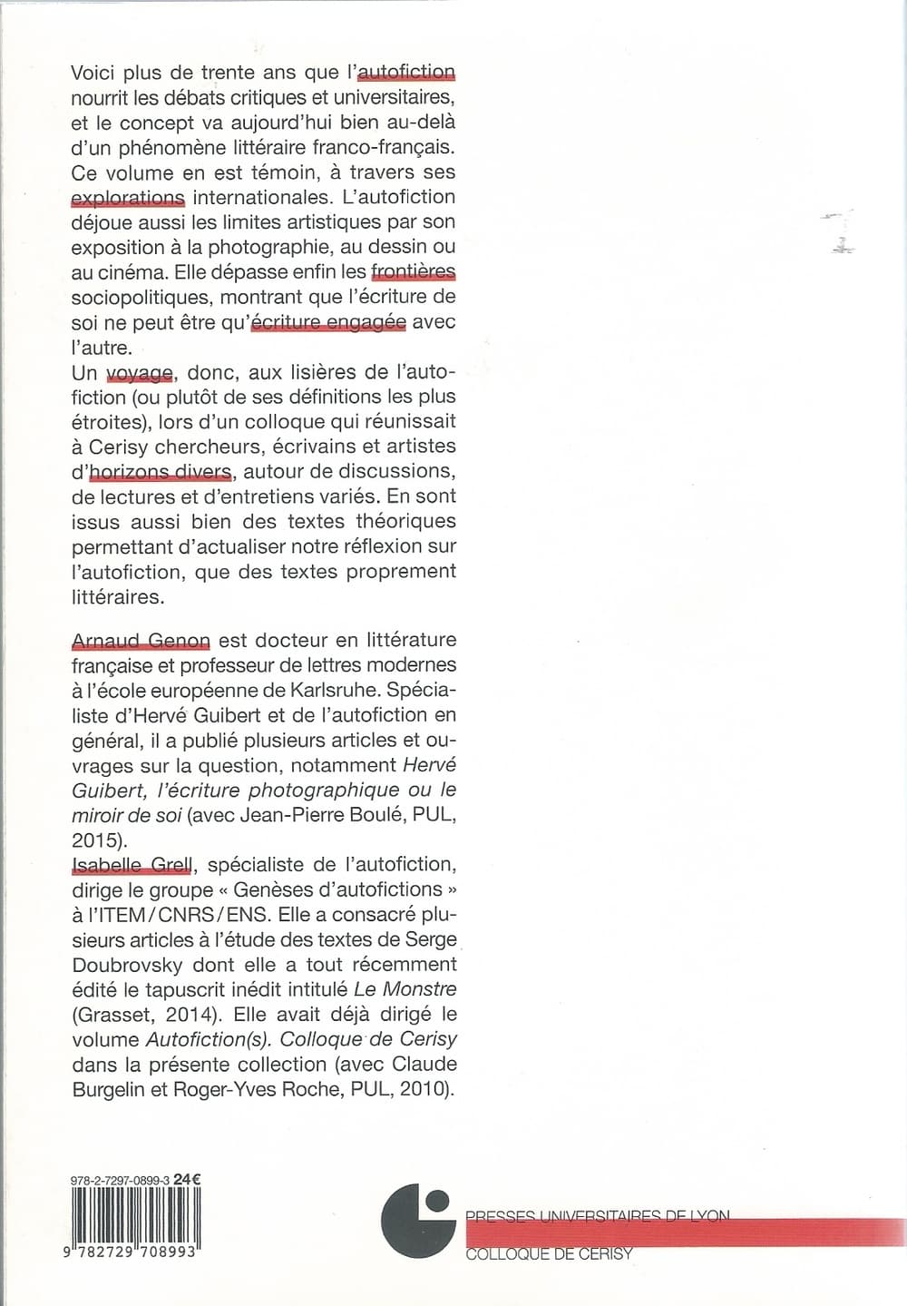 2016 LISIÈRES DE L'AUTOFICTION, dirigé par Isabelle Grell et Arnaud Genon, Colloque de Cerisy 2012
